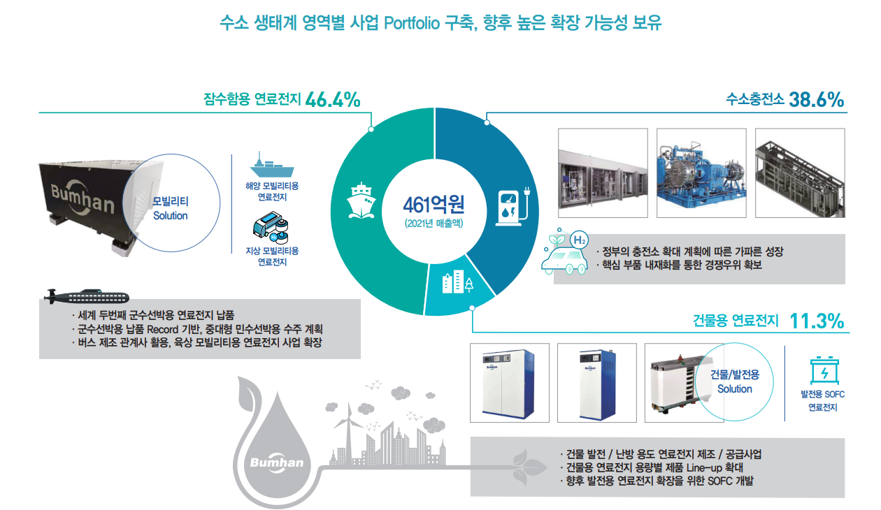즉 기존의 발전용 연료전지에 비해 활용도가 높아진 기술을 가지고 있습니다. 현재 매출의 50% 이상이 잠수함용 연료전지에서 발생하고 있으며 향후 정부의 수소 충전소 인프라 확대에 따라 매출 증가를 기대해볼 수 있습니다. 그 밖에 건물용 발전에도 연료전지 매출이 10% 정도 있습니다.