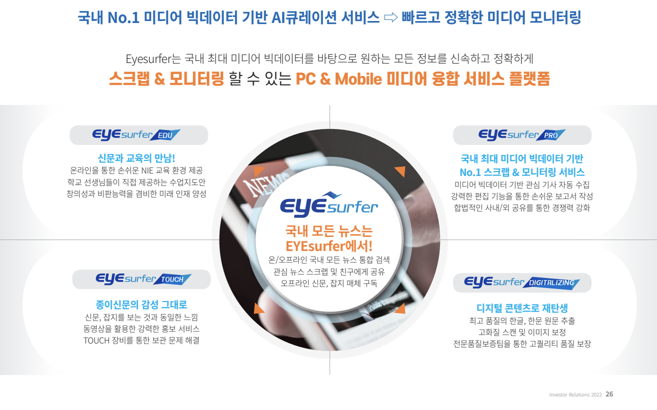 2004년 디지털 라이징 및 라벨링 저작도구 '아이루트(EyeRoot)'를 활용하여 국내 주요 매체와의 협력을 하고 있으며 현재 300억 건이 넘는 국내 최대 규모의 미디어 빅데이터를 구축하고 있습니다.